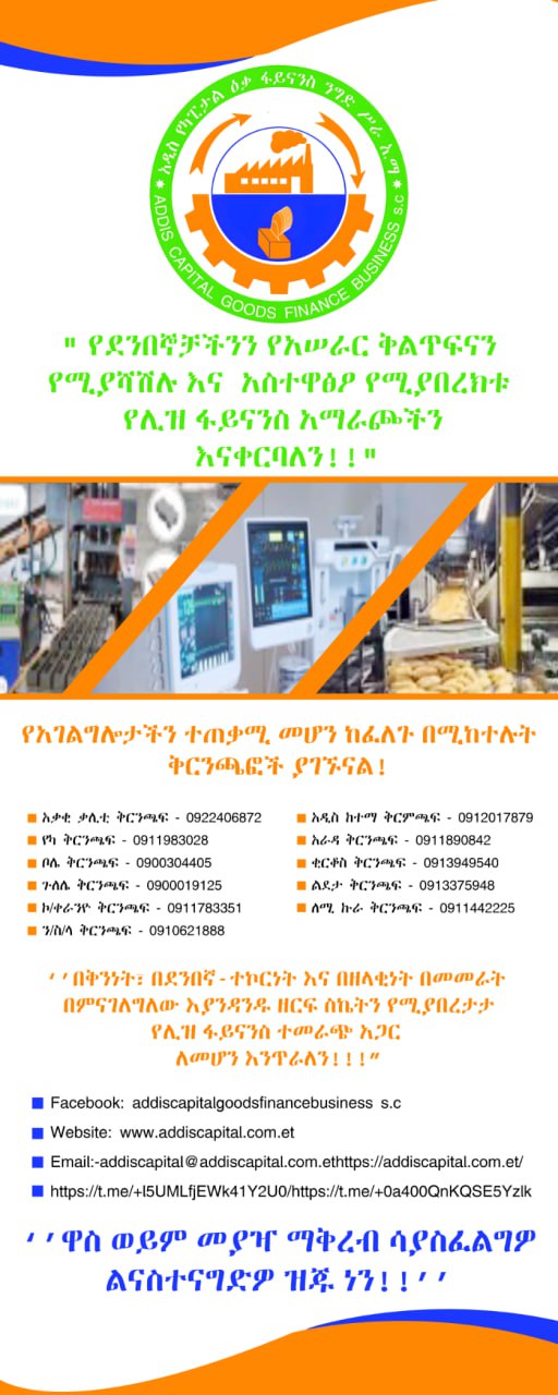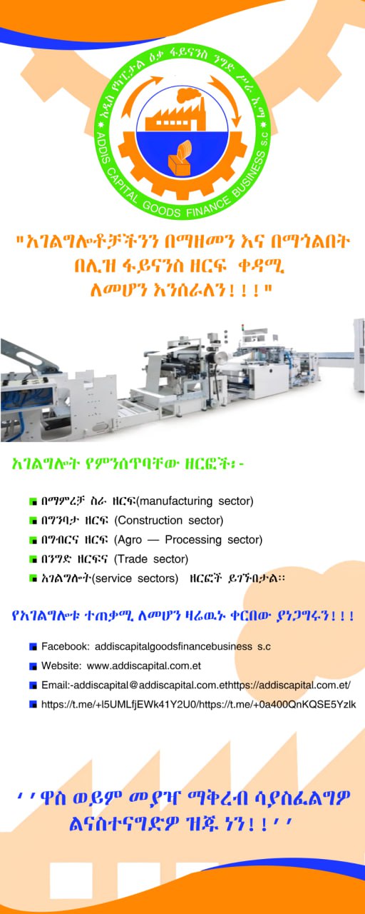 አዲስ የካፒታል ዕቃ ፋይናንስ ንግድ ስራ አ.ማ ፣ በተለያዩ ኢንዱስትሪዎች የተነደፉ ለተለያዩ ዘርፎች አገልግሎት የሚውሉ የካፒታል ዕቃዎችን በሊዝ ያስጠቅማል። ስራዎን ለማስፋፋትም ሆነ ለመጀመር እየፈለጉ ከሆነ፣ በትንሽ ቅድመ ክፍያ ሸክሞን በመጋራት ዘመናዊ መሣሪያዎችን እንዲያገኙ እናደርጋለን፡፡